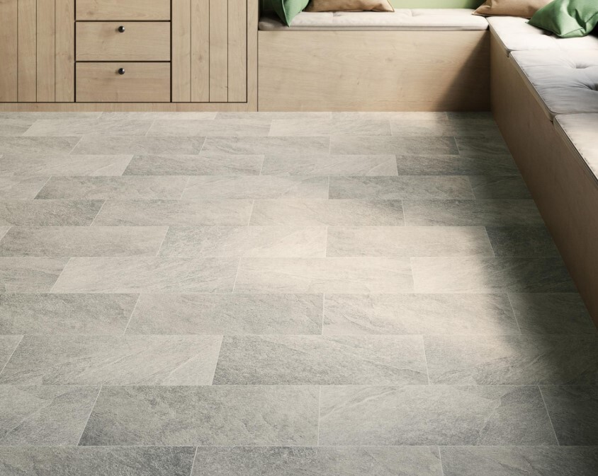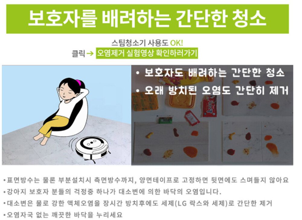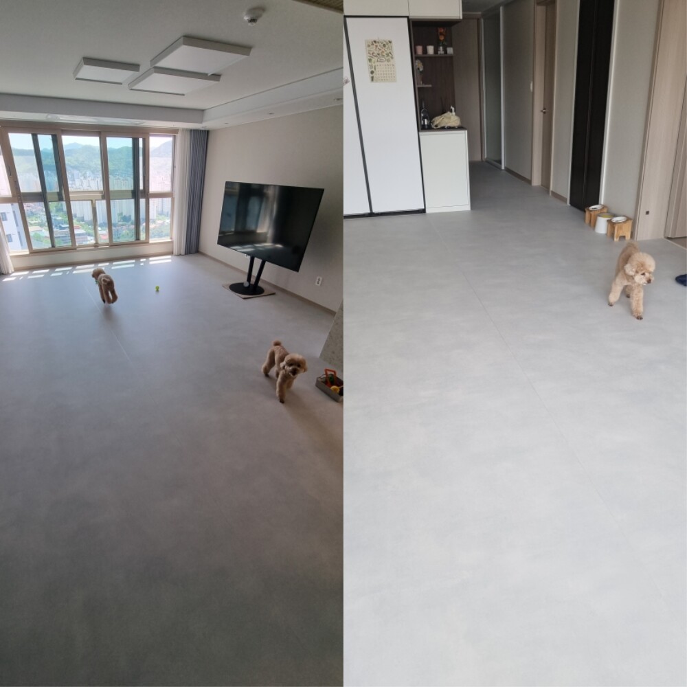 4mm 두께의 텍스타일 뒷면으로 사람에게도 편안한 보행감 . 타일크기 33cmx66cm 장판 전체폭 200cm